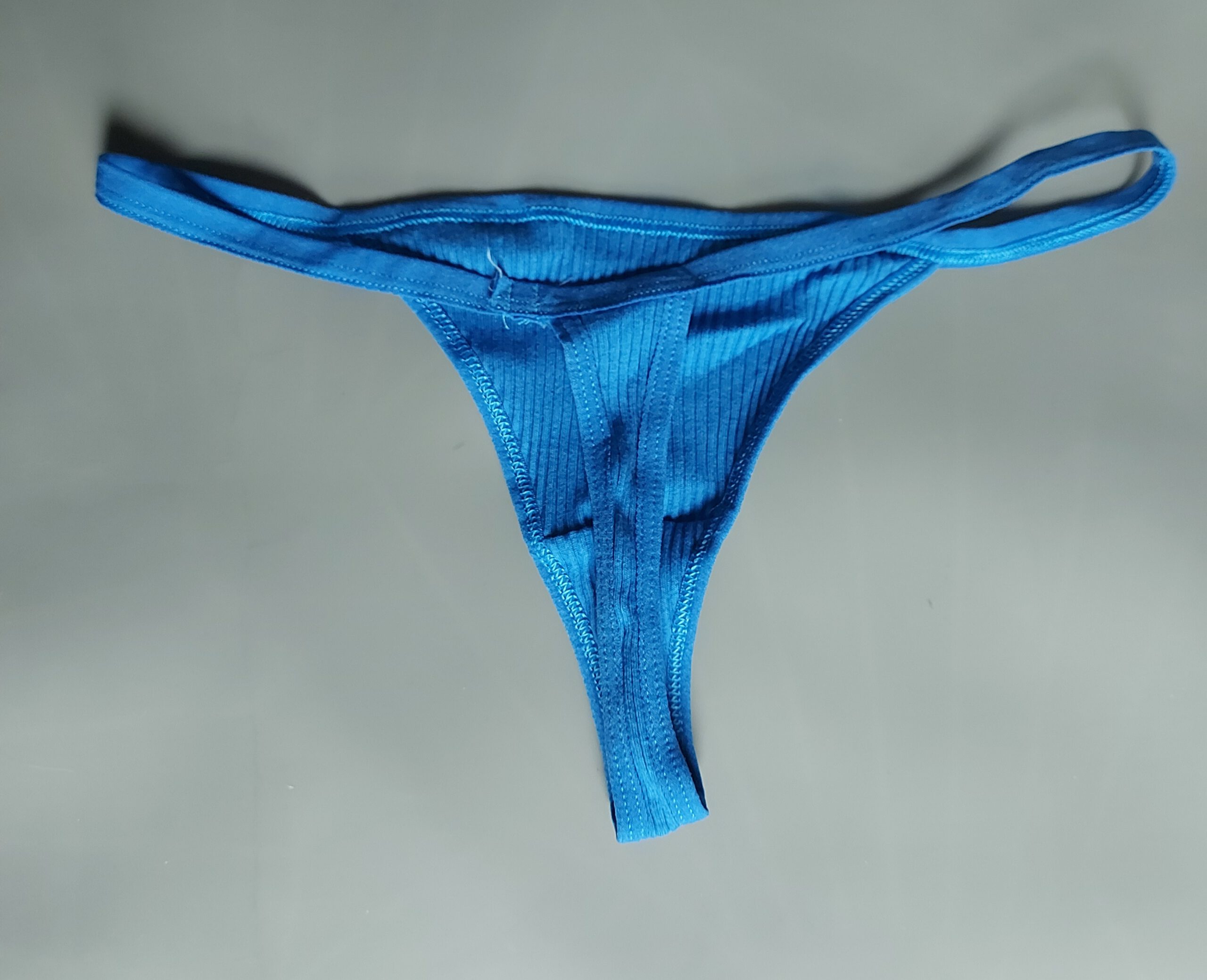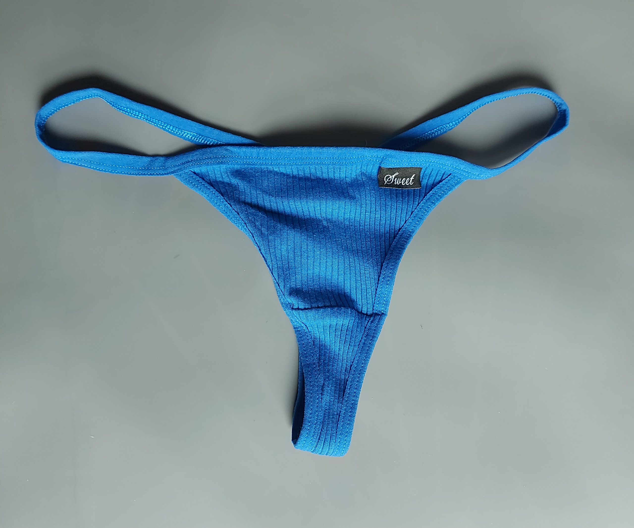 Blauwe string met label waar ‘sweet’ op staat.