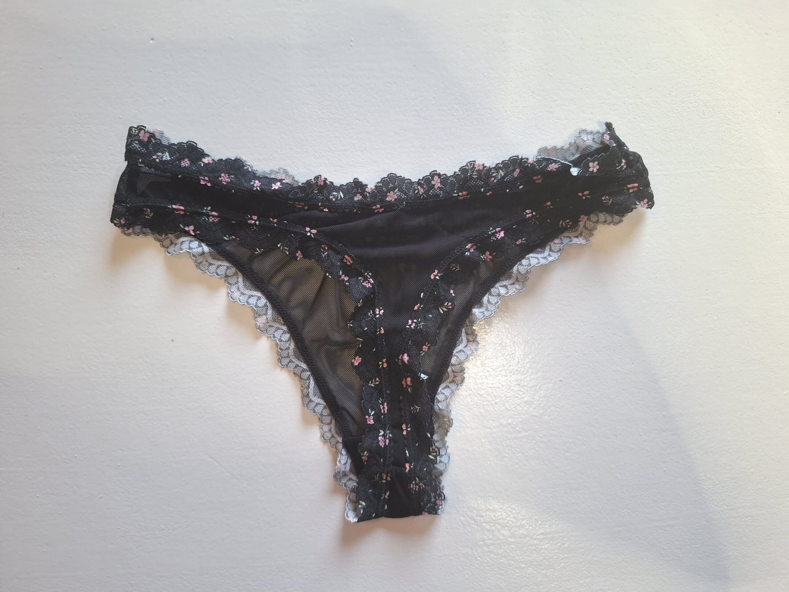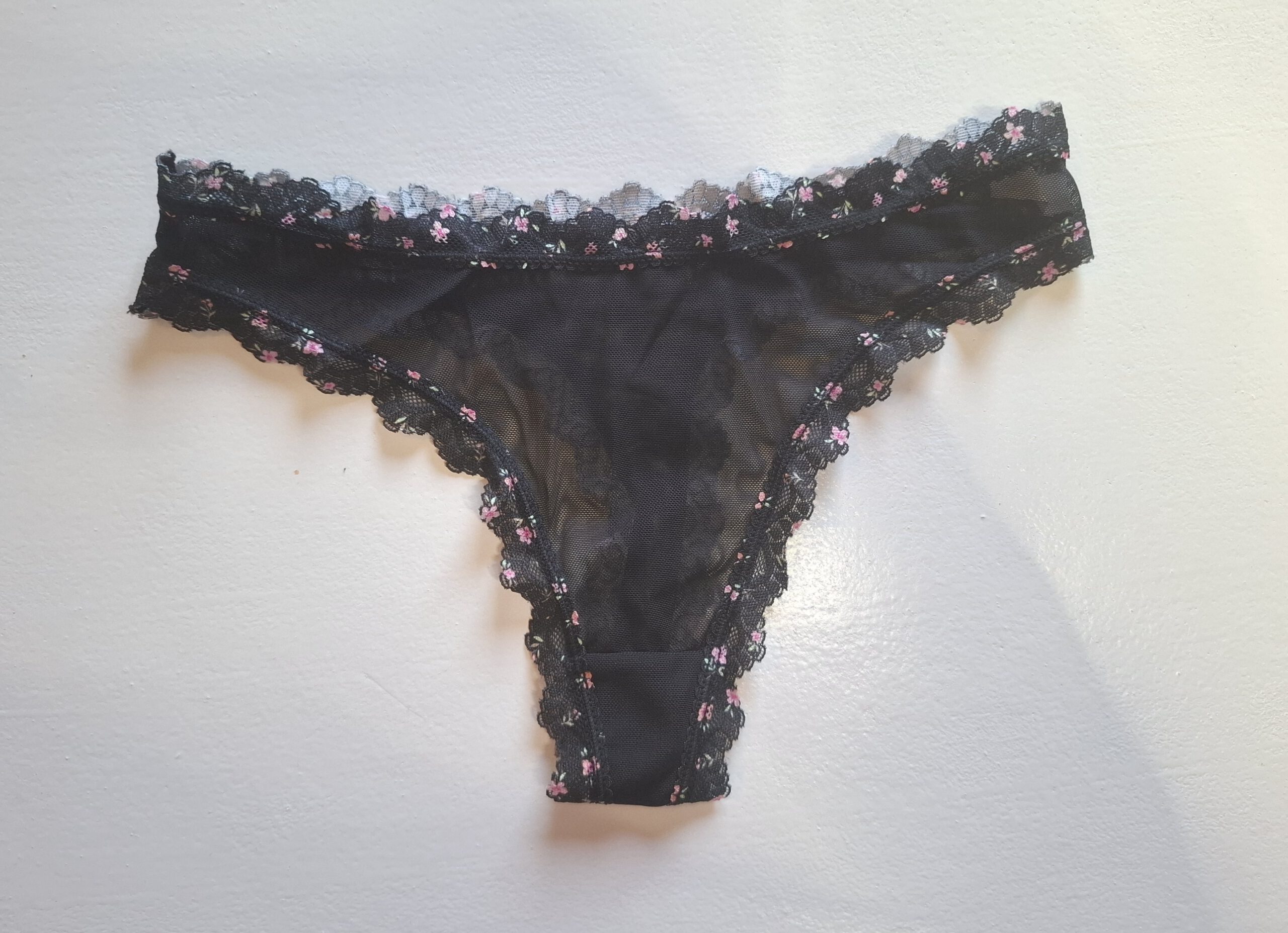 Zwarte string, met aan de randjes bloemetjes patroon. String is doorschijnend