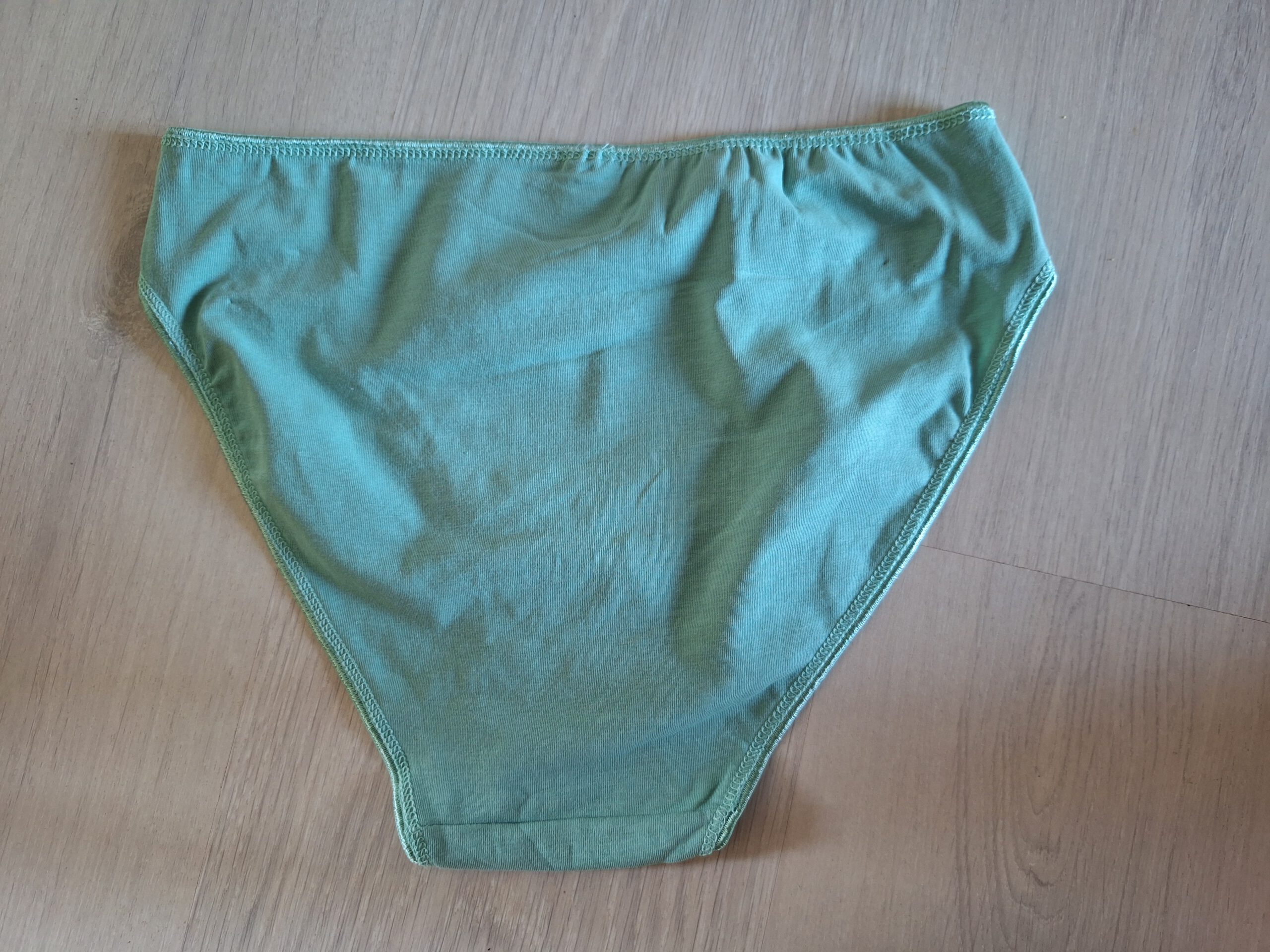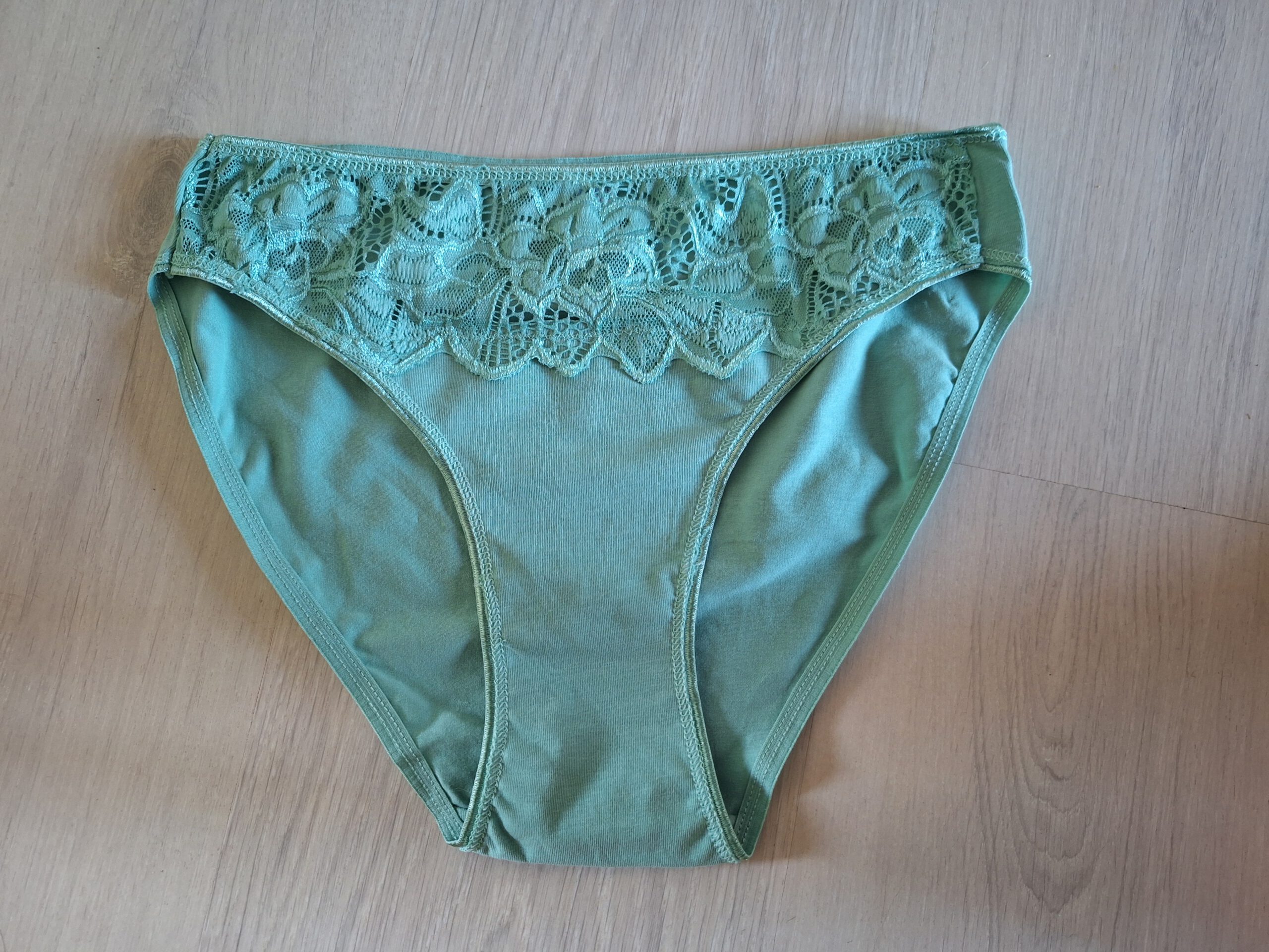 Ik draag dit mooie turquoise slipje graag voor je. Het is een katoenen slipje met kanten randje, maat M.