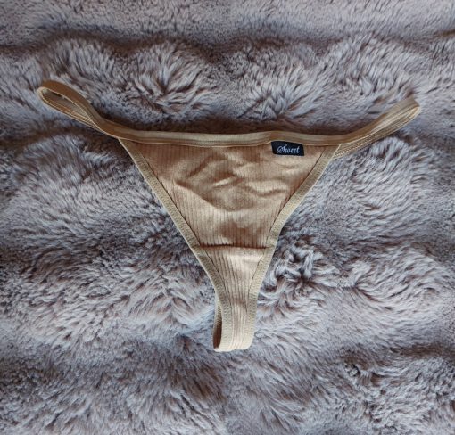 Lichtbruine string met tekst ‘sweet’. Valt mij klein.