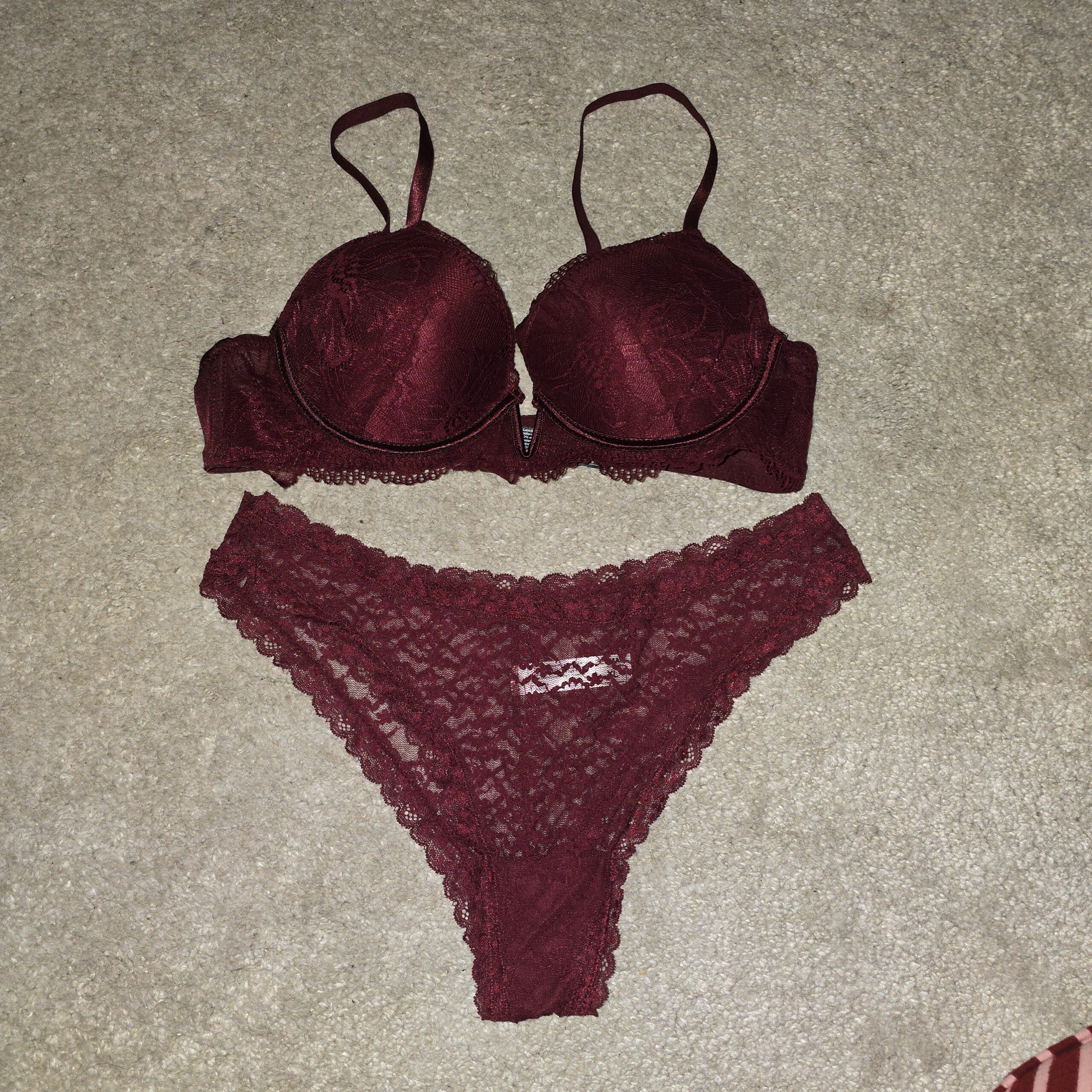 Sexy setje met bh net diepe uitsnede voor en kanten details. Met doorschijnende slip en katoenen kruisje.