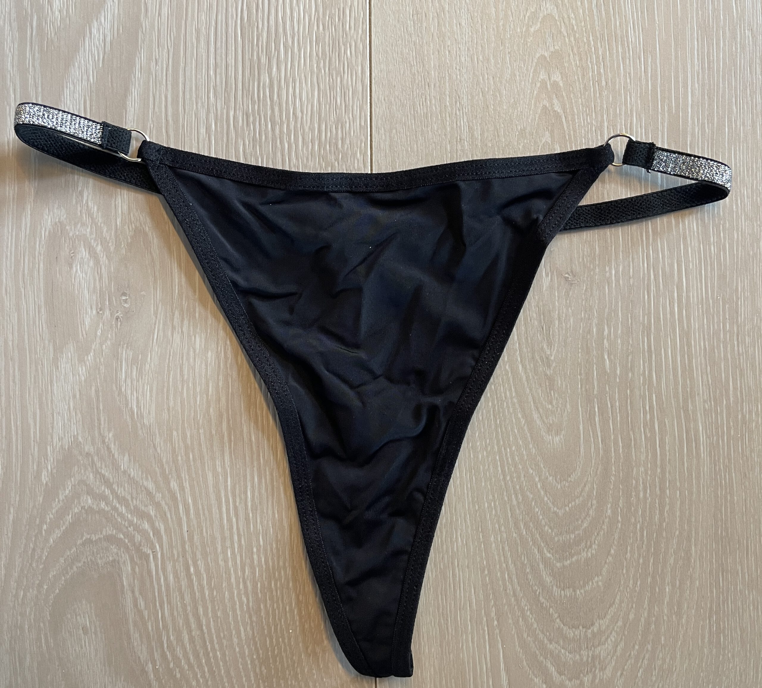 Mooie zwarte string met glitterbandjes en een metalen hartjessieraad boven mijn billen