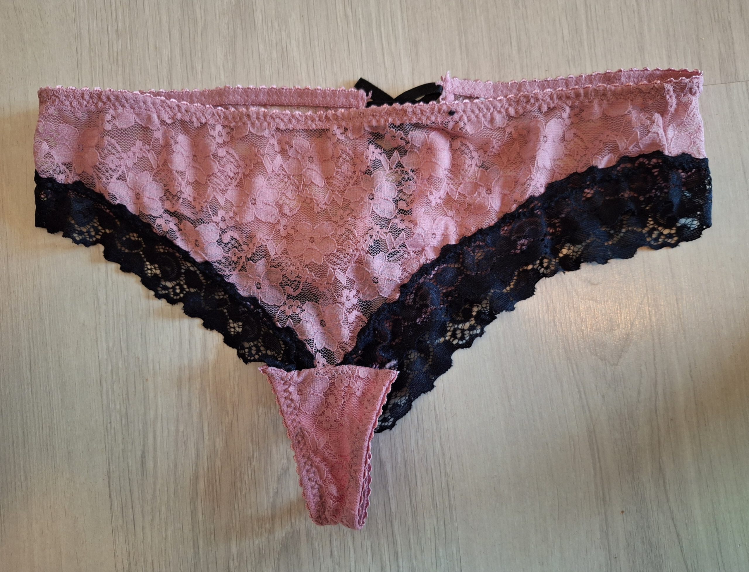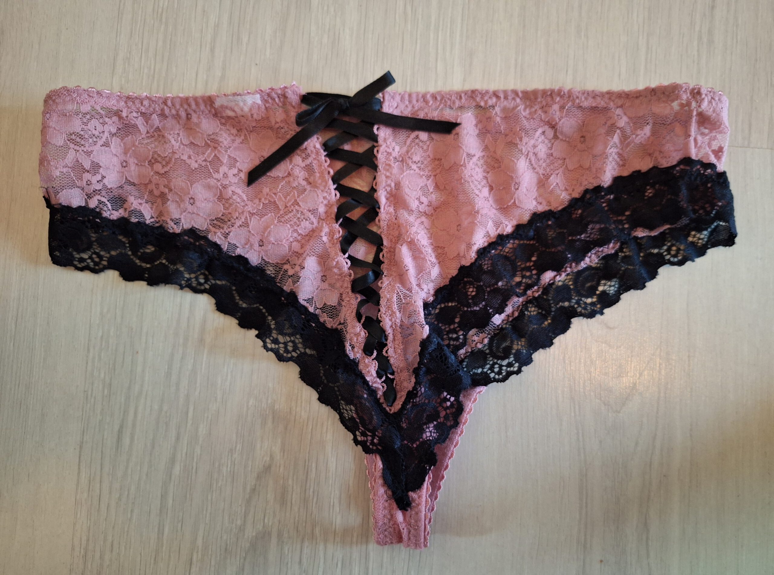 Mooi sexy roze met zwart gedragen hipster. Met een bijzondere achterkant met zwart lintje.