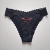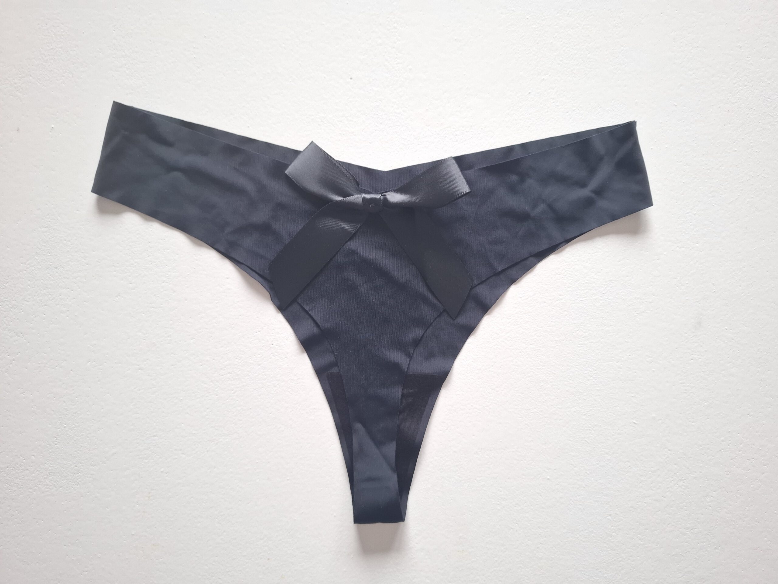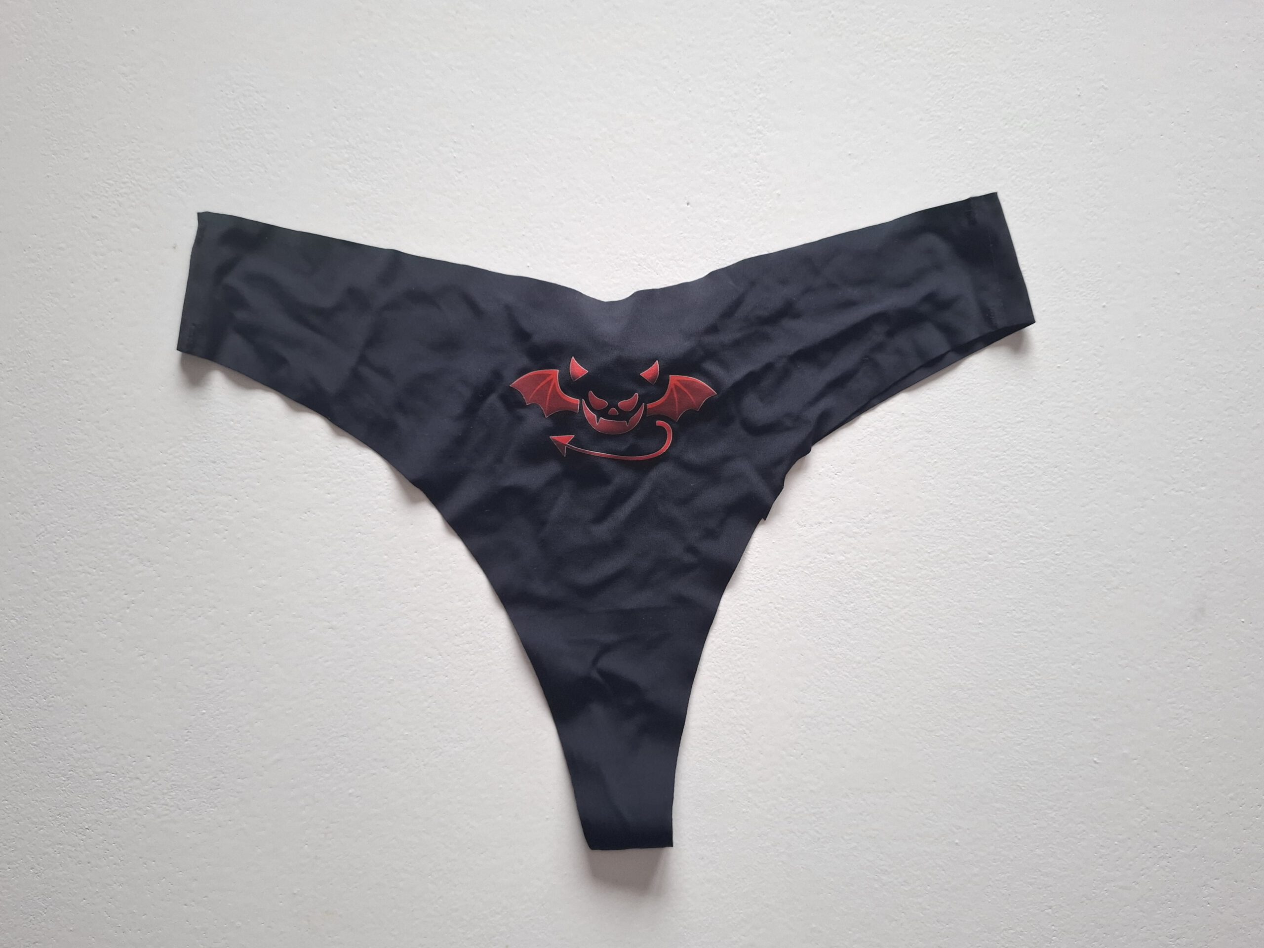 Zwarte naadloze string met een duivel afbeelding op de achterzijde een grote strik