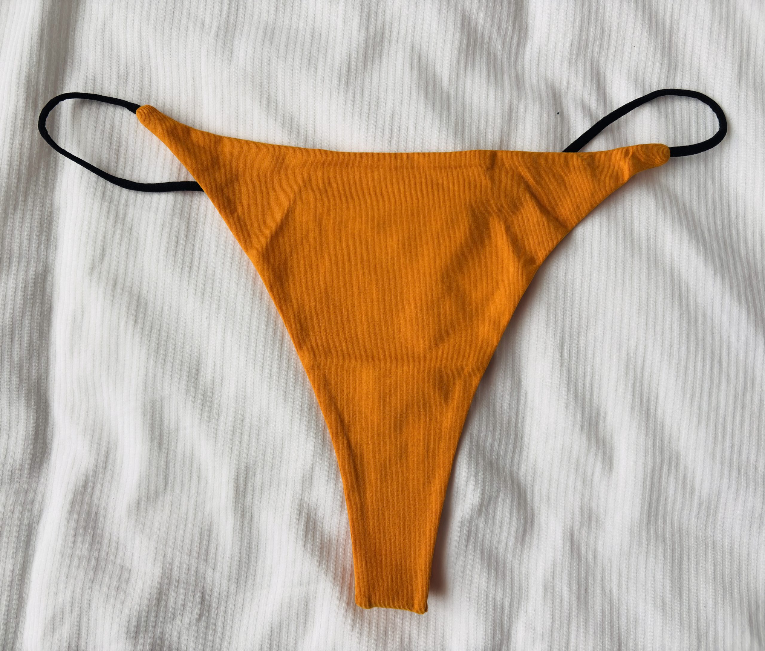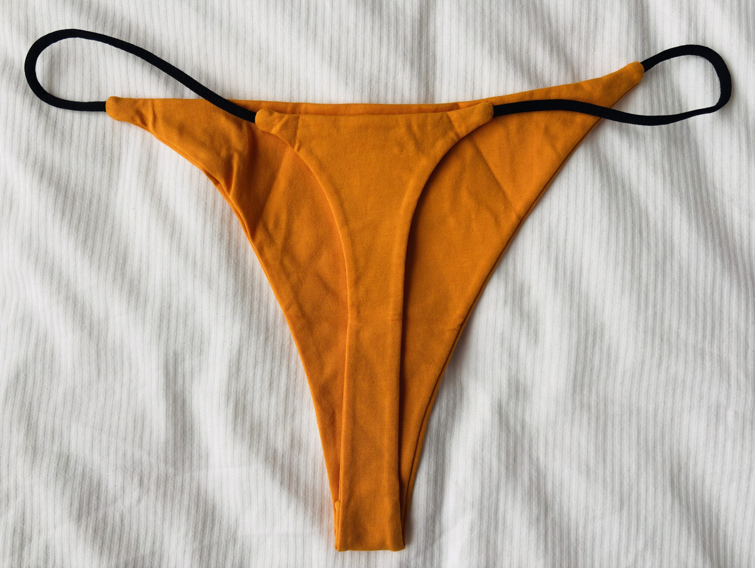 Een oranje string van katoen met zwarte bandjes.