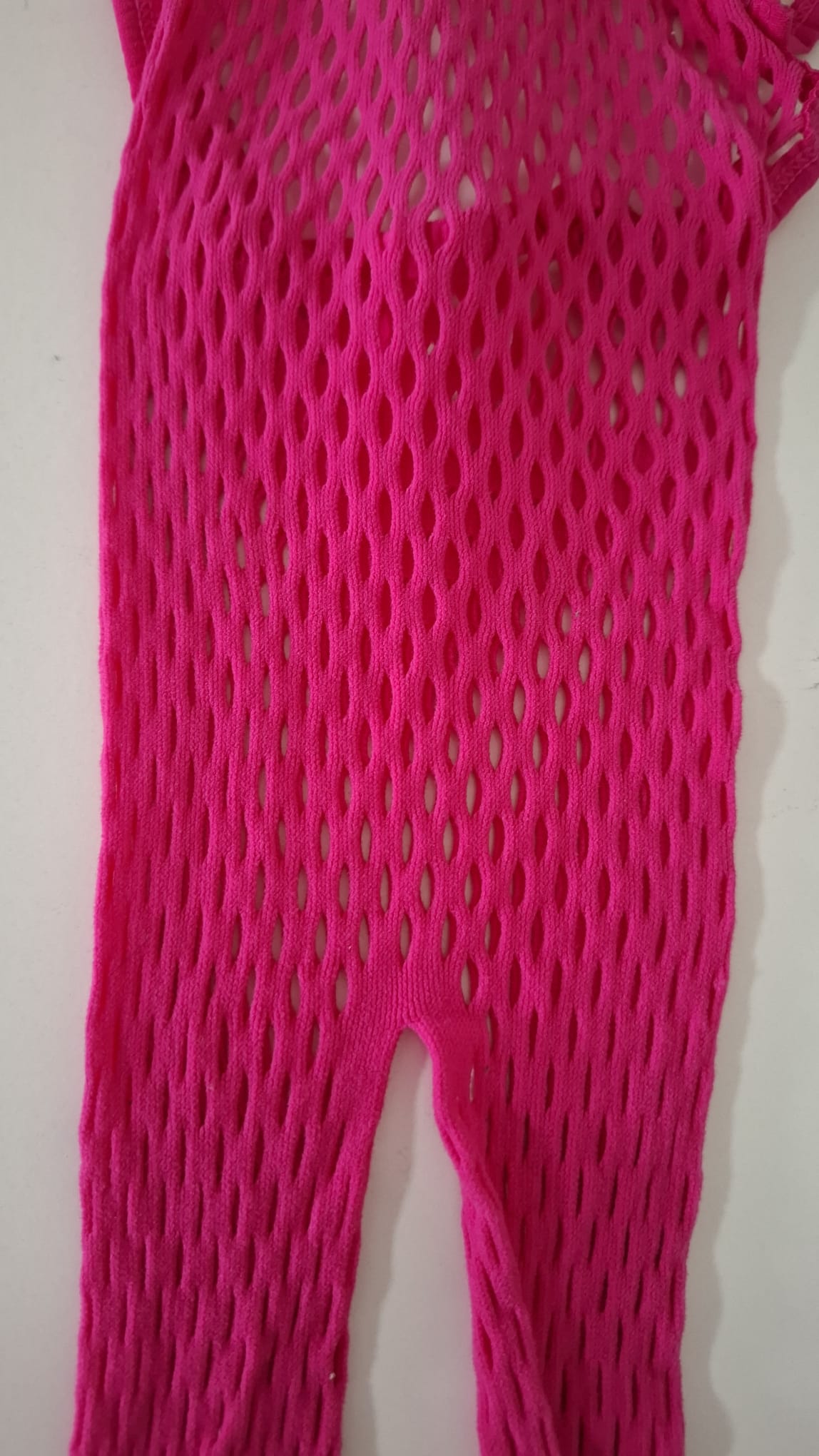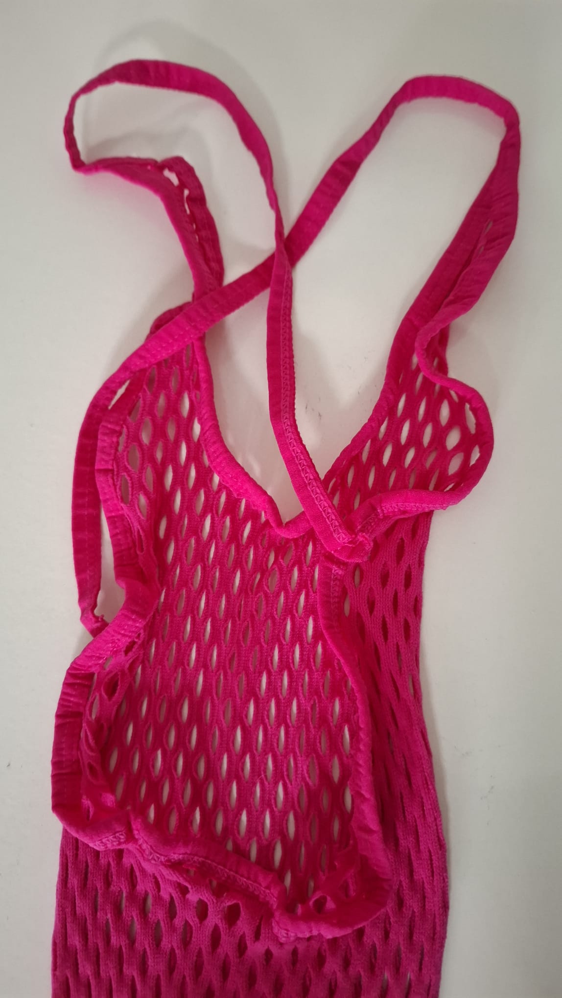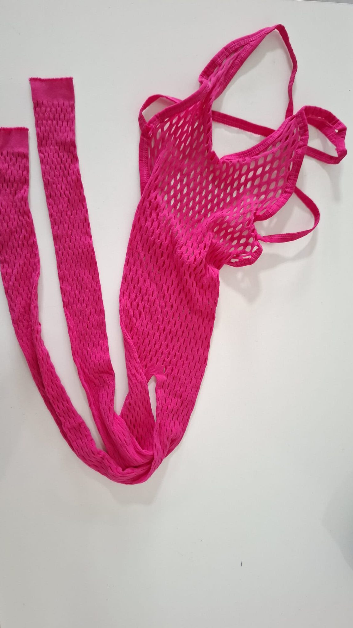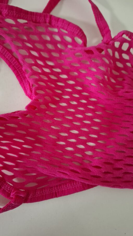 Roze fishnet body, maatje S. De bandjes kruisen elkaar op de achterkant.